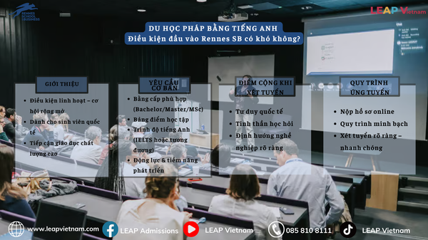 Khi lên kế hoạch du học Pháp bằng tiếng Anh, việc hiểu rõ điều kiện đầu vào là bước quan trọng giúp sinh viên chuẩn bị hồ sơ hiệu quả, và Rennes School of Business là một trong những trường kinh doanh quốc tế tại Pháp với quy trình tuyển sinh minh bạch và linh hoạt, tạo điều kiện thuận lợi cho sinh viên từ nhiều quốc gia khác nhau.