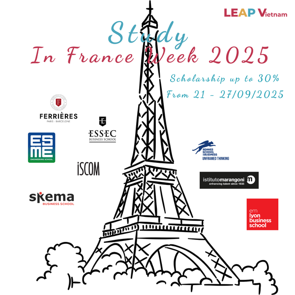 🇫🇷 Tuần lễ Du học Pháp 2025 – Study in France Week sẽ diễn ra từ 21 – 27/9/2025 tại Hà Nội và TP. Hồ Chí Minh, tiếp nối thành công của các năm trước. Sự kiện là cầu nối quan trọng giữa học sinh, sinh viên Việt Nam và các trường đại học hàng đầu của Pháp và châu Âu, mang đến cơ hội khám phá các chương trình cử nhân và thạc sĩ 100% bằng tiếng Anh với nhiều ngành học hấp dẫn: